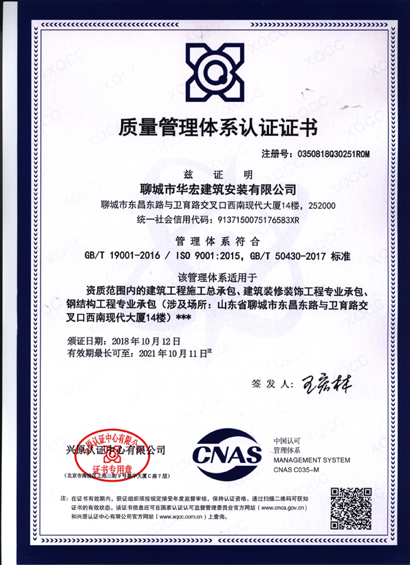 聊城市華宏建筑安裝有限公司成立于2002年5月,公司自2002年成立以來,不斷發(fā)揚 “敬業(yè)修身 打造精品 開拓創(chuàng)新 弄潮勇進”的創(chuàng)業(yè)精神,始終遵循“以質量求生存、靠精品創(chuàng)品牌、憑信譽贏市場”的宗旨,認真奉行“科學 高效 一流”的質量方針